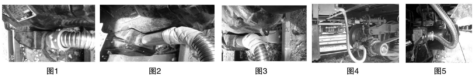 制作一段60mm長的全牙的外絲,將其兩端分別與接線盒和螺接式金屬軟管接頭進行連接。考慮到接線盒與電機外殼空間狹窄,接頭無法旋轉緊固,決定將電機接線盒的緊固螺栓松開,接線盒會略向外遠離電機外殼一些,這樣就給出了足夠金屬軟管接頭旋轉的空間。將軟管接頭旋緊后,保證其凸起處不朝向電機外殼則不會發生干涉,再將接線盒重新進行緊固即可。由于省去了鍍鋅管的長度,金屬軟管折彎處不再存在超出限界的可能性。至此線束防護完全復合工藝要求,該問題得到了徹底解決(如圖5)。